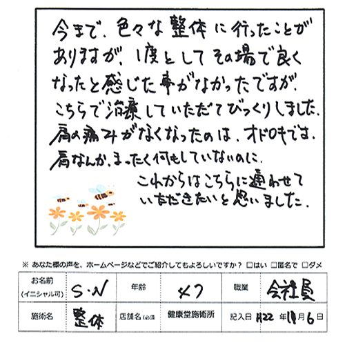 肩の痛み改善。(口コミ評判:大府市在住)♪