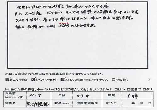 女性の方に多い、ホルモンバランスの乱れ、リンパの滞りも気功整体では治療可能です。