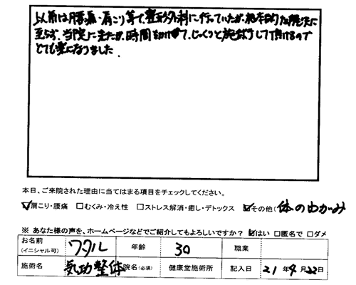 らず、貴院に来たら時間をかけてじっくり施術して頂けるので、とて